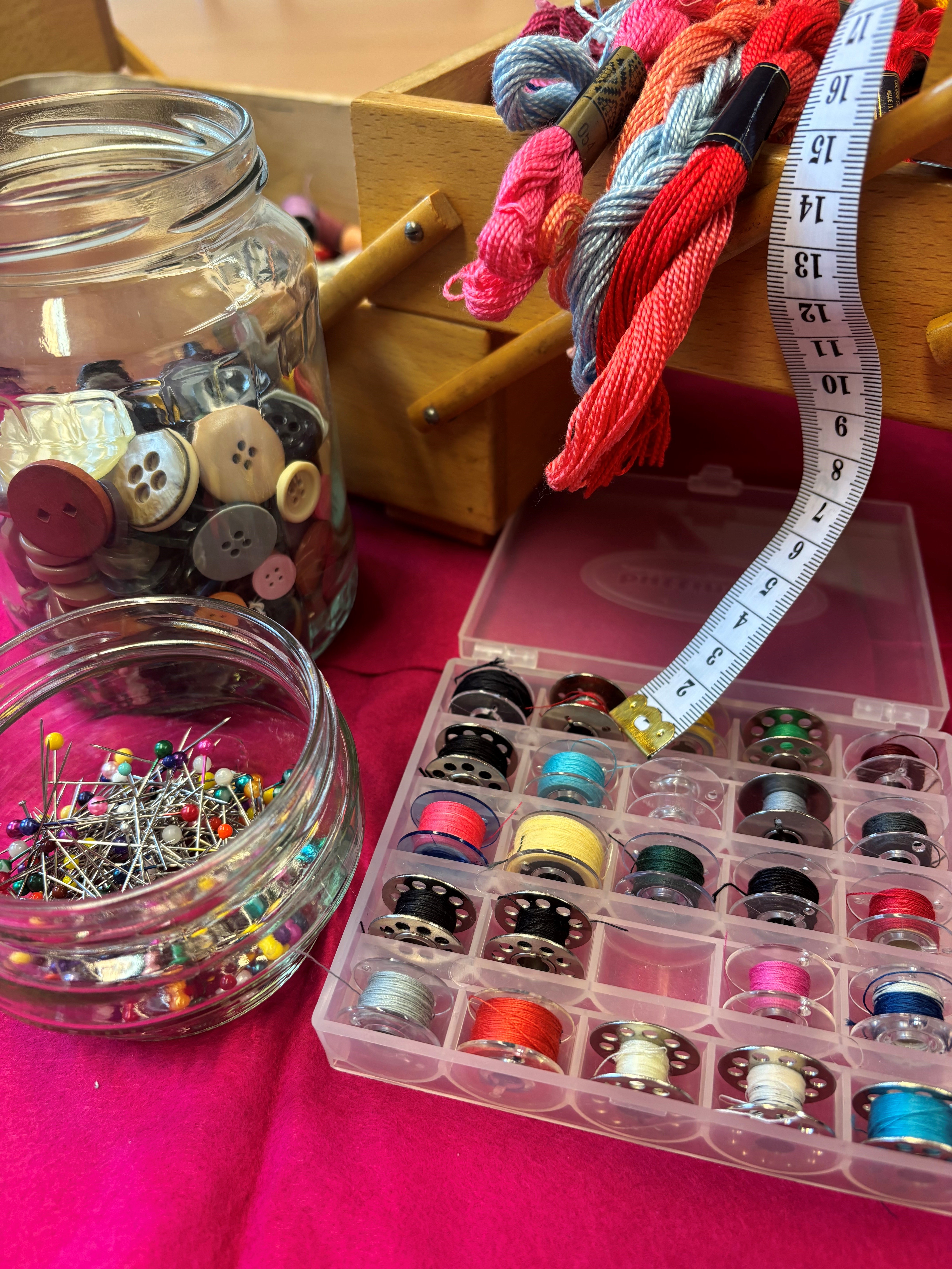 Nähmaterial Stecknadeln Maßband  Knöpfe Spulen